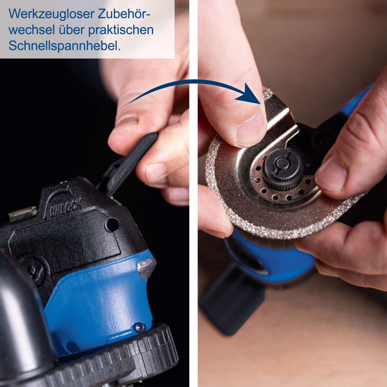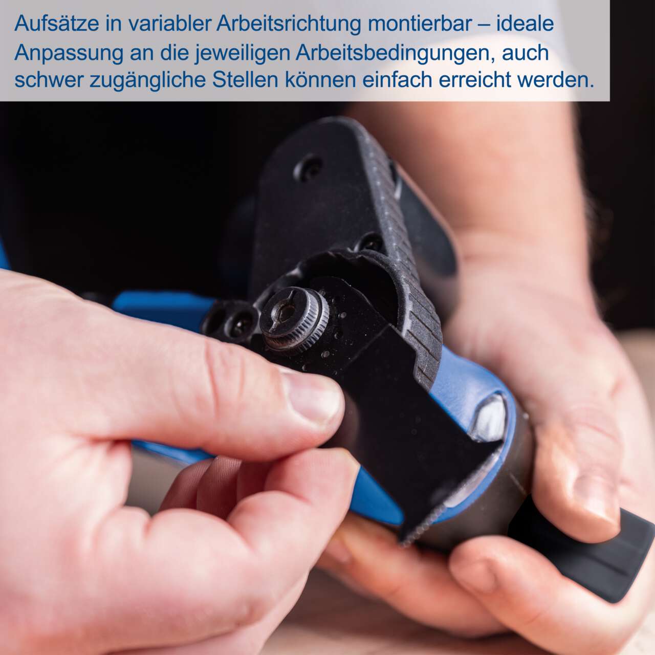 - A tartozékok változtatható munkairányban felszerelhetők, ideálisak a széleken és nehezen elérhető helyeken végzett precíz munkához. Szerszám nélküli tartozékcsere a praktikus szorítókarnak köszönhetően.
