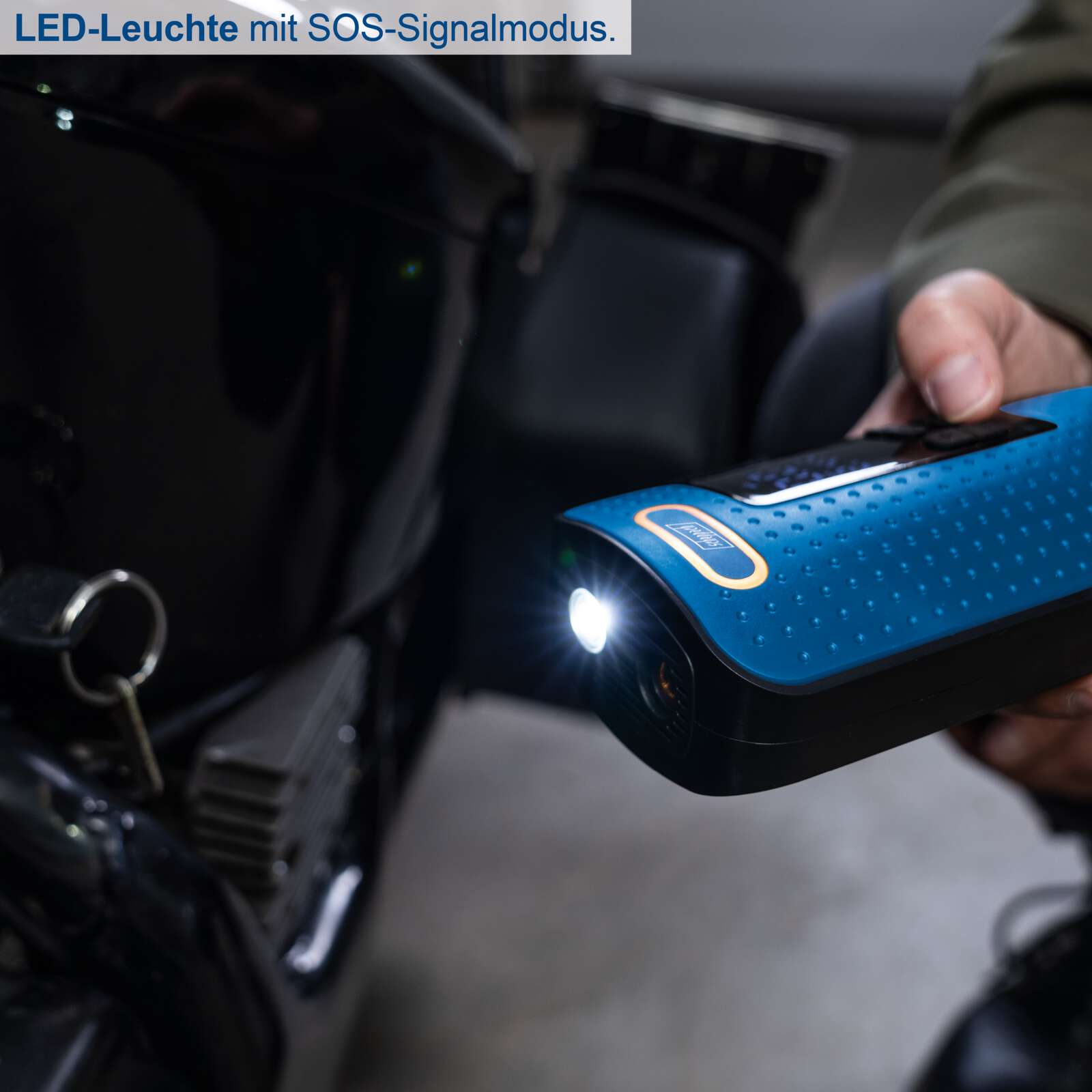A Scheppach AC10/8V akkus kézi kompresszor, maximálisan 10,3 bar üzemi nyomással, egy praktikus, hatékony eszköz útközben, ideális autó- vagy kerékpárabroncsok, labdák és légmatracok felfújásához. A kompakt kompresszor öt üzemmóddal rendelkezik: kerékpár üzemmód, motorkerékpár üzemmód, autó üzemmód, labda üzemmód és kézi üzemmód. Az LCD kijelző mutatja a kiválasztott üzemmódot, az aktuális nyomást, a nyomás mértékegységét és az akkumulátor kapacitását. Egy további jelzőfény (sárga/zöld/piros) is tájékoztatást nyújt az aktuálisan mért légnyomásról.