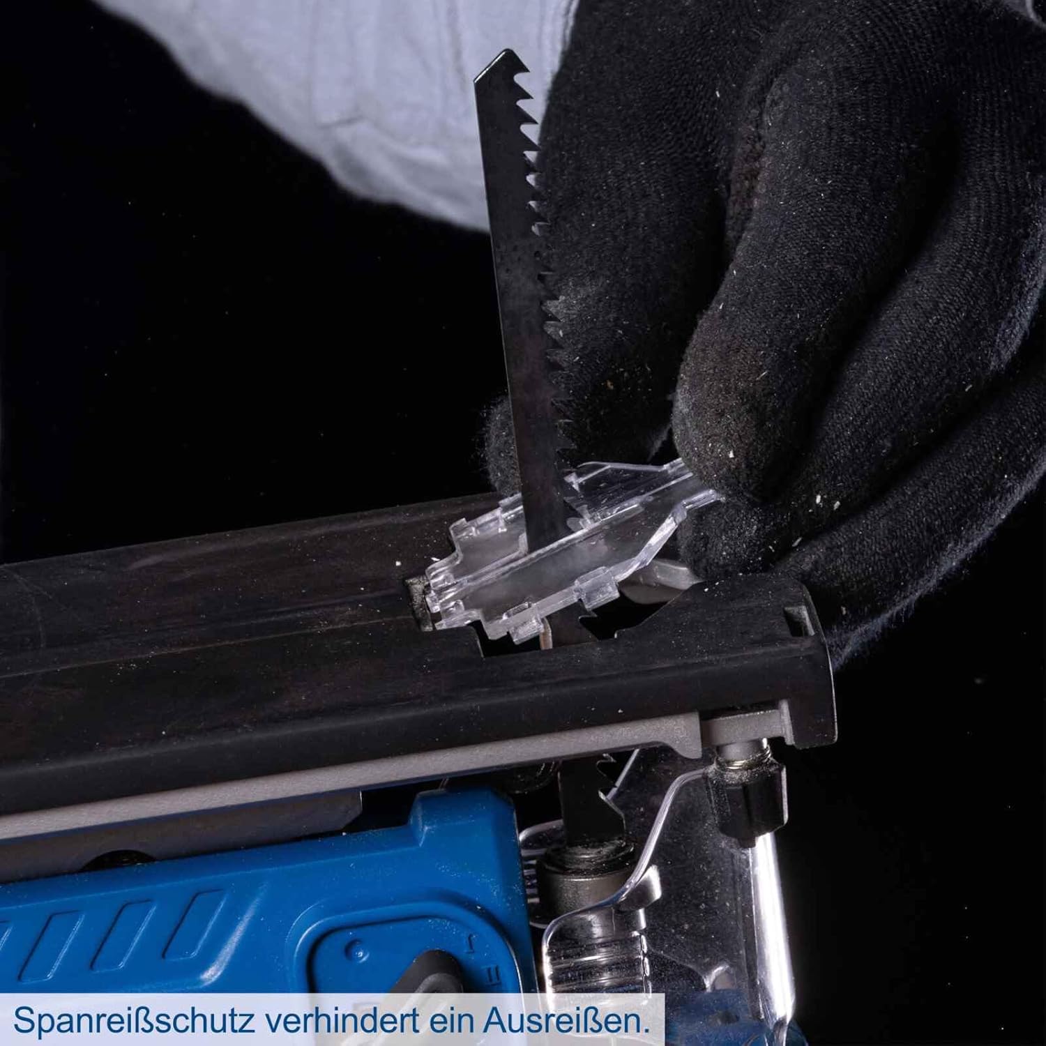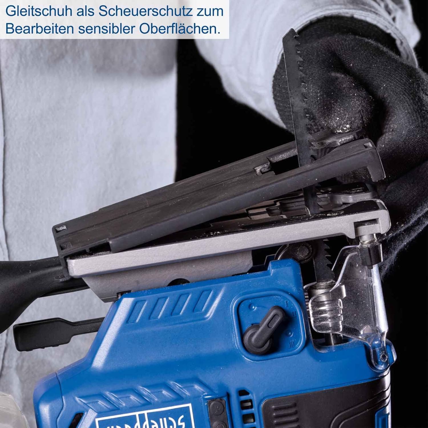 • A forgácsszakadás elleni védelem megakadályozza a szakadást. Csúszótalp kopásvédelemként érzékeny felületeken végzett munkákhoz. A fúvófunkció forgácsmentes vágási vonalat biztosít.