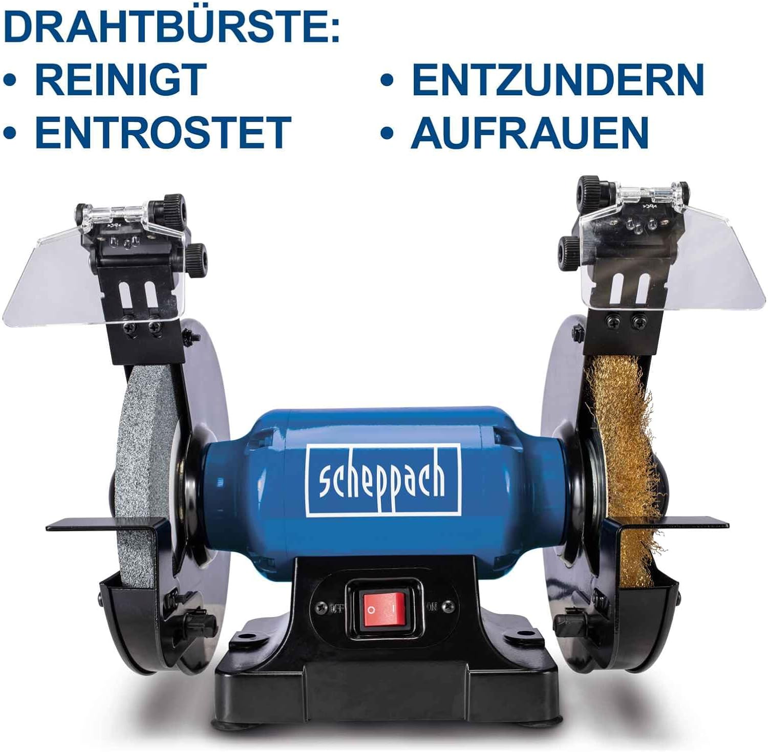Az SM200LB dupla csiszológép nélkülözhetetlen eszköz minden műhelyben, mivel az éles szerszámok elengedhetetlenek a hatékony munkavégzéshez. Kompakt, 390 x 260 x 290 mm-es méreteivel kevés helyet foglal a munkapadon, és mindig használatra kész. 12 kg-os súlyával és négy lábbal való alátámasztásával kivételesen stabilnak bizonyul a csiszolás során. Mindazonáltal szükség esetén az öntöttvas talp előre fúrt furatai segítségével a munkapadhoz csavarozható. Egy simán járó és tartós, 500 wattos, 2950 fordulat/perc fordulatszámú indukciós motor biztosítja a szükséges teljesítményt a két 200 mm-es köszörűkorong meghajtásához. Az SM200LB egy 20 mm széles köszörűkoronggal (K36 szemcseméret) és egy 16 mm széles drótkefével rendelkezik. A drótkefe a munkadarabok tisztítására vagy forrasztásra és hegesztésre való előkészítésére szolgál. Ha a köszörűkorong elkopik, cseréje gyors és egyszerű. Egy elemes LED lámpa van felszerelve mind a köszörűkorong, mind a kefekorong fölé, amely optimális megvilágítást biztosít a munkaterületen. Ezáltal az élezendő szerszámok esetleges hibái jobban láthatóvá és könnyebben korrigálhatók. A jó fényviszonyok a köszörülési folyamat jobb irányítását is lehetővé teszik. Az élezés során enyhe nyomást alkalmaznak, hogy a köszörűkorong állandó sebességet tartson fenn, ami a lehető legjobb eredményt eredményezi. A munkadarabot az acél munkadarab-támaszra helyezzük, és lassan, a kívánt szögben a köszörűkorong felé mozgatjuk, amíg el nem éri a korongot. A munkadarab-támasz magassága az alkalmazástól és a munkadarabtól függően állítható. Az optimális köszörülési eredmény elérése és a köszörűkorong egyenletes kopásának biztosítása érdekében a munkadarabot kissé előre-hátra kell mozgatni a korongon. A munkadarab-tartó felett egy állítható szikravédő található. Ez egyénileg beállítható, hogy megvédje a felhasználó szemét a csiszolási folyamat során. Ugyanakkor átlátszó, és tiszta rálátást biztosít a köszörülendő munkadarabra.