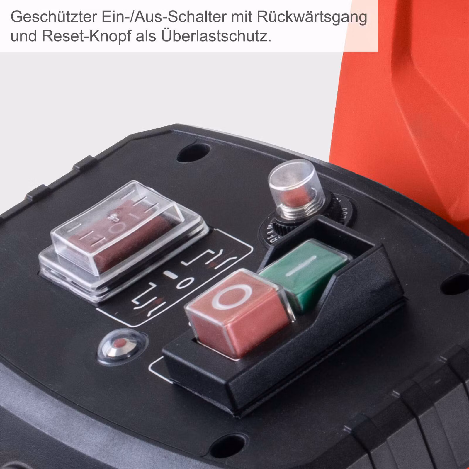 - Védett be-/kikapcsoló és visszaállító gomb túlterhelés elleni védelemként újraindítás elleni védelemmel
