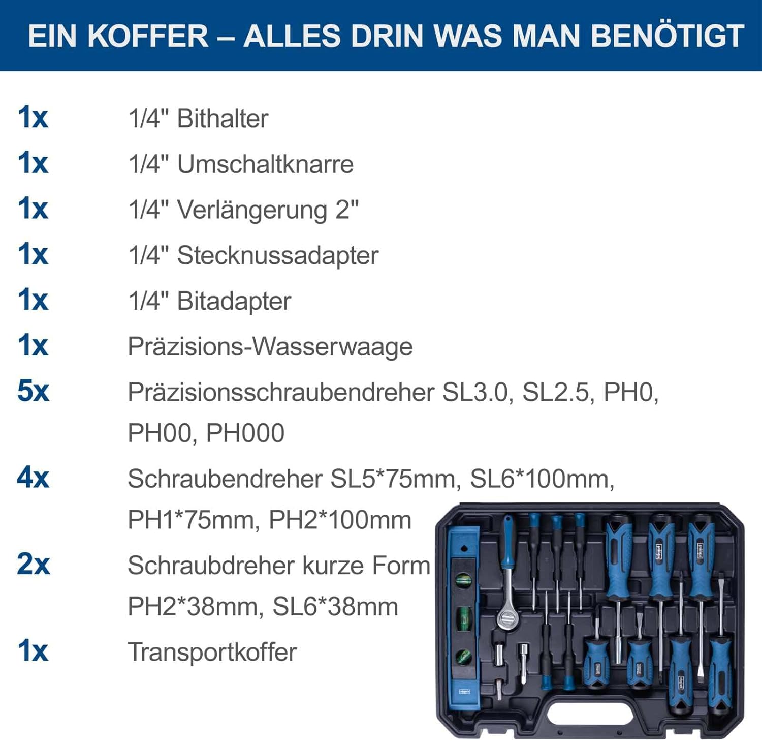 • 5 db precíziós csavarhúzó SL3.0, SL2.5, PH0, PH00, PH000 / 4 db csavarhúzó SL5 x 75 mm, SL6 x 100 mm, PH1 x 75 mm, PH2 x 100 mm / 2 db csavarhúzó PH2 x 38 mm, SL6 x 38 mm / 44 db 25 mm-es bit / 1 db szállítókoffer